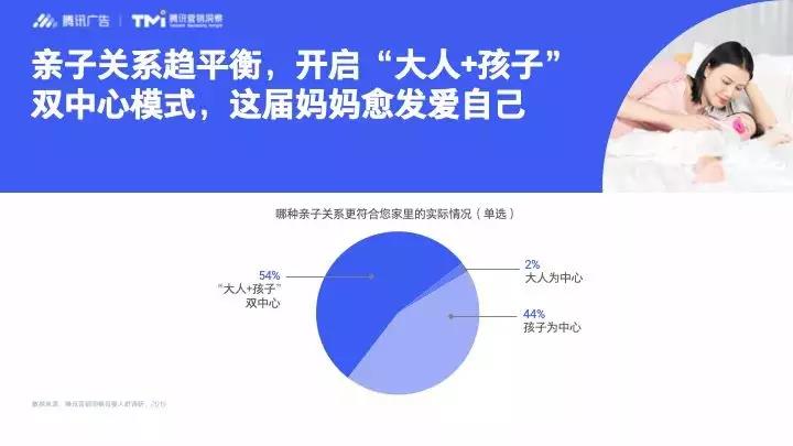在过去,“一切为了孩子”是我国普遍的家庭模式,然而随着90后“辣妈”成为母婴主流人群,这种家庭关系已悄然改变。数据洞察显示,当前的亲子关系趋于平衡,“大人+孩子”双中心模式成为更多家庭的选择(54%)。这一届妈妈们努力挤出更多时间给自己,她们爱美、爱玩、爱学习,面对育儿压力懂得自我释放和纾解,看剧看综艺成为放松、调节情绪的较好出口。